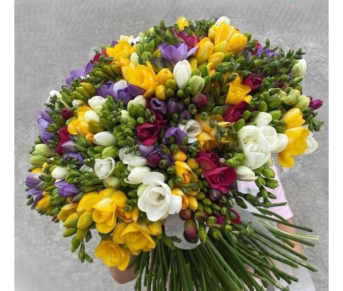 Intampina primavara cum se cuvine, si anume cu acest superb buchet de frezii. Buchetul de flori este alcatuit din 101 de frezii de diferite culori. Frezia este o floare de sezon, care apare primavara; este frumos mirositoare si intr-o gama variata de culori. Floraria online din Timisoara, Flori in Timisoara.ro s-a gandit la tine si a creat acest superb si delicat buchet de frezii, pentru a aduce primavara in inimile persoanelor dragi.