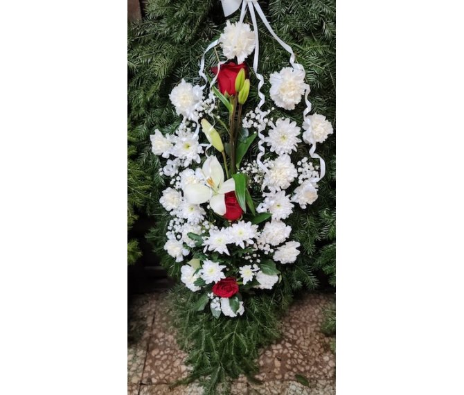 Coroana funerara cu flori naturale are urmatoarele dimensiuni: lungime aproximativ 115 cm si latime aproximativ 40 cm