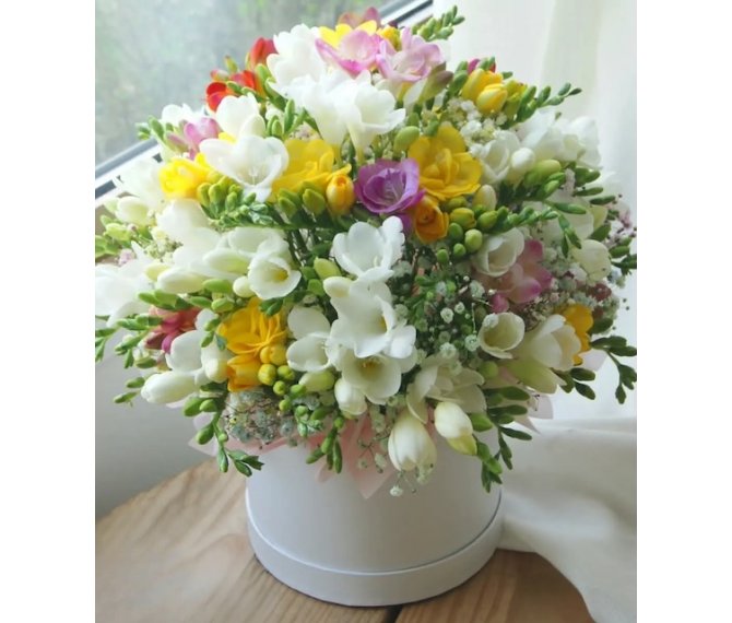 37 de Frezii colorate in culori vii si jucause de primavara formeaza un superb aranjament floral . Trimite-le persoanei dragi cu floraria online Flori in Timisoara.ro si in mod sigur va fii un inceput bun de primavara. Imaginea este cu titlul de prezentare, cutia poate sa difere in functie de stocul existent.